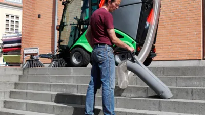 ✓ 5 m lange uittrekbare zuigslang kan netjes worden weggeborgen op de veegcontainer.